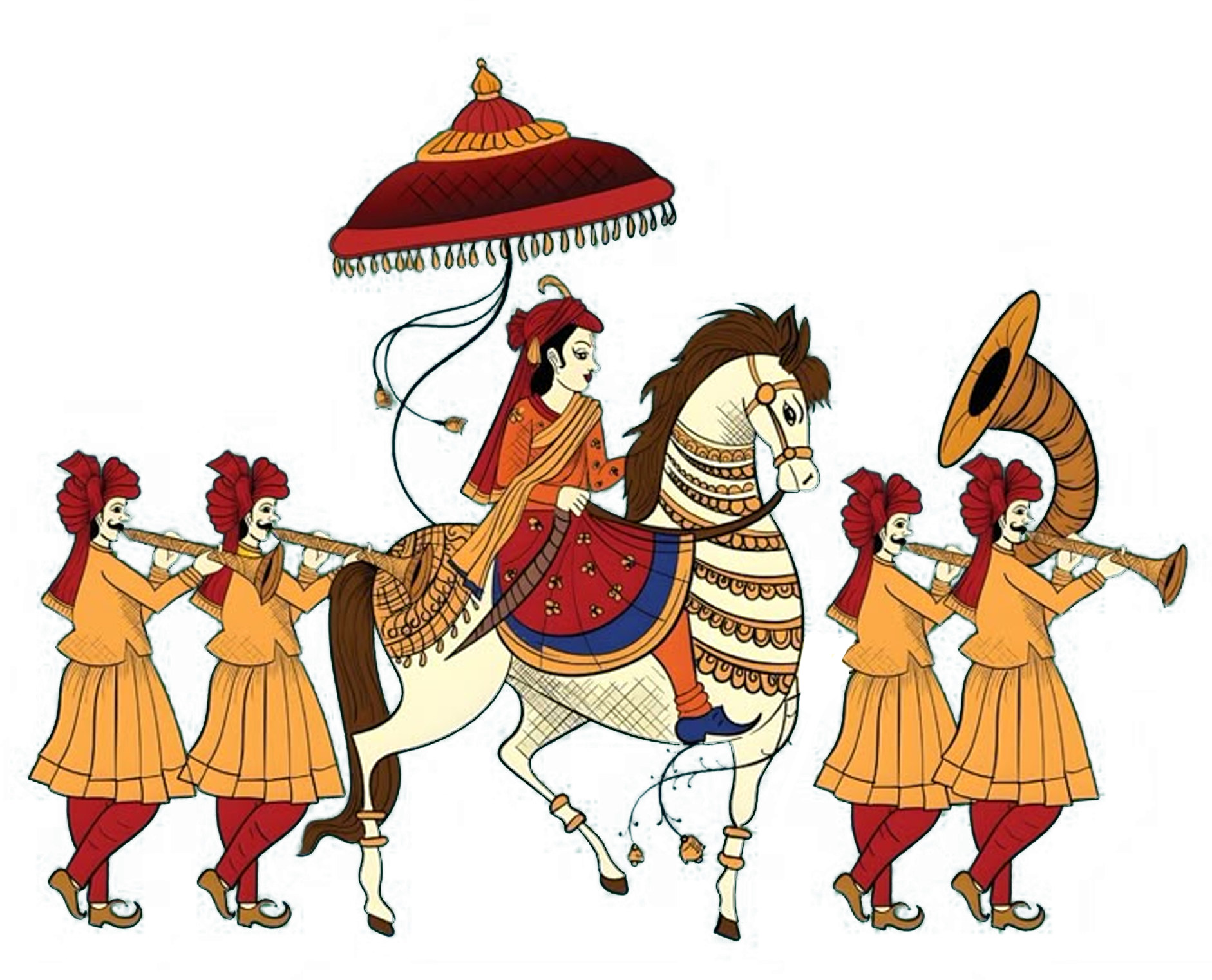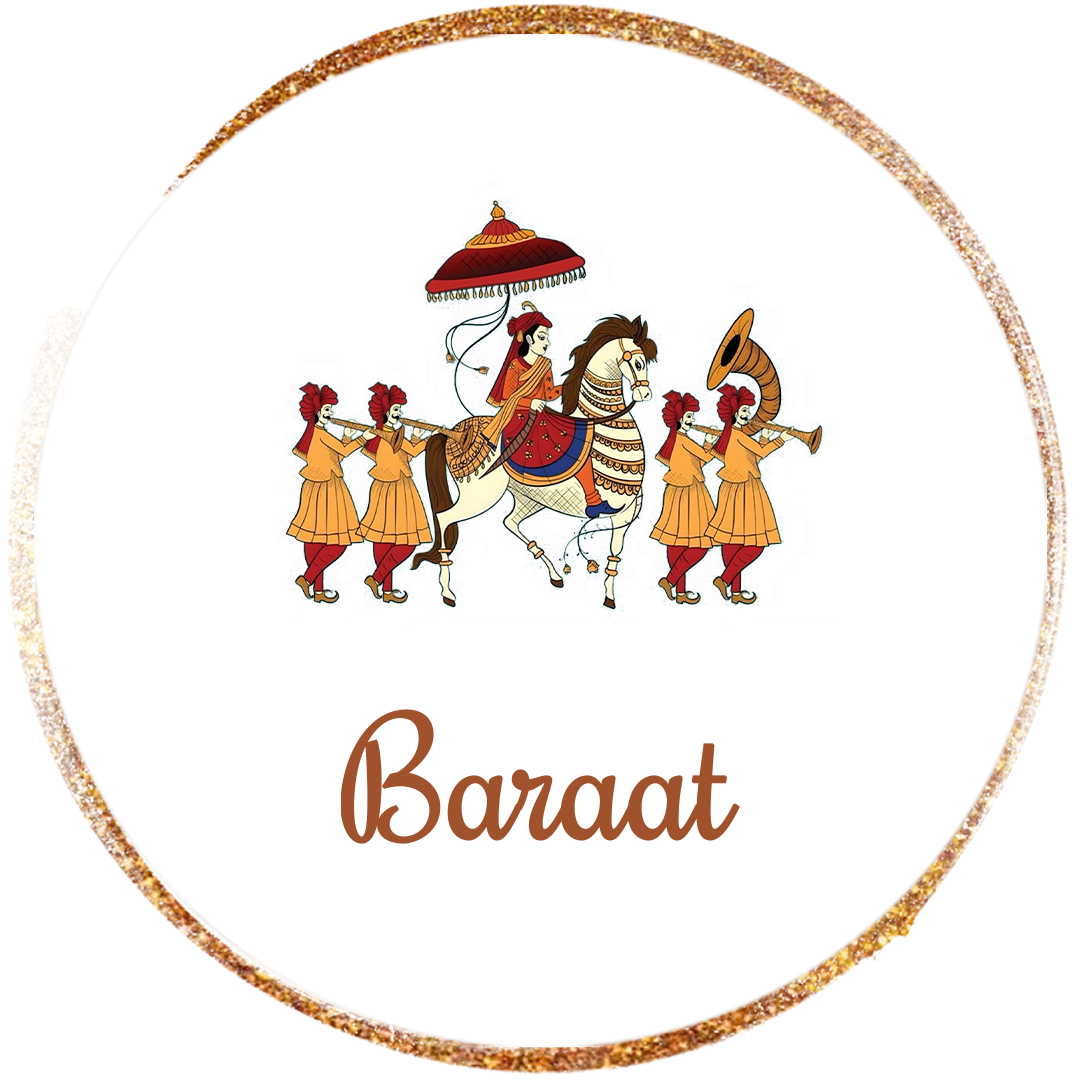 The Baraat is the groom's joyous wedding procession, symbolizing his journey to meet his bride, marked by music, dancing and vibrant celebration as friends and family escort the groom, often on a decorated horse or vehicle, to the wedding venue for a grand welcome by the bride's side. It signifies the groom's readiness and the collective happiness and pride of both families in uniting.