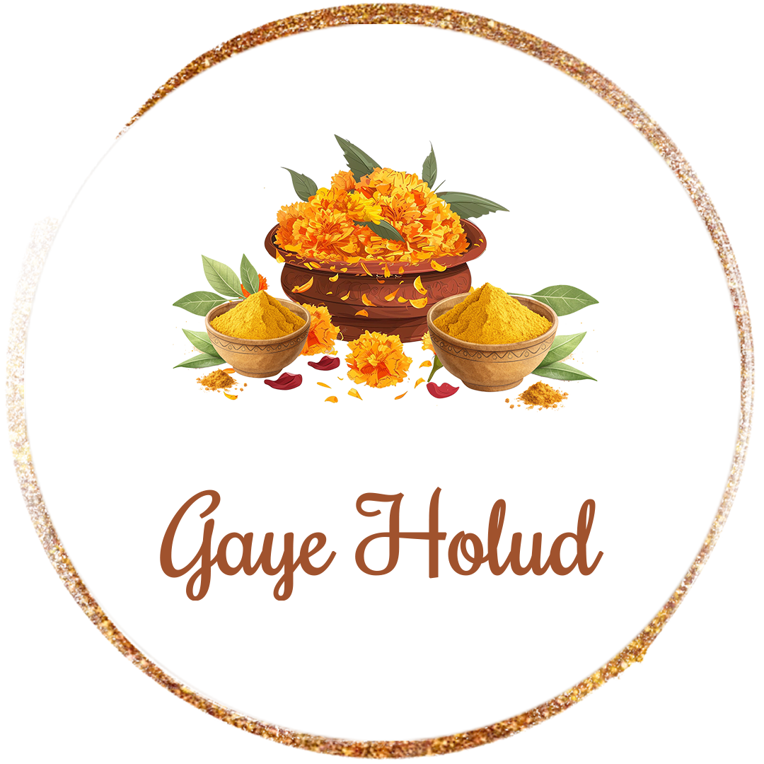 A traditional Bengali pre-wedding ritual symbolizing purification, beauty and blessings. Turmeric (holud) paste is applied to groom and bride to cleanse the skin, preceded by a ceremony to repel negative energy before the wedding. It’s a joyous event where family and friends unite through shared rituals, music and songs.