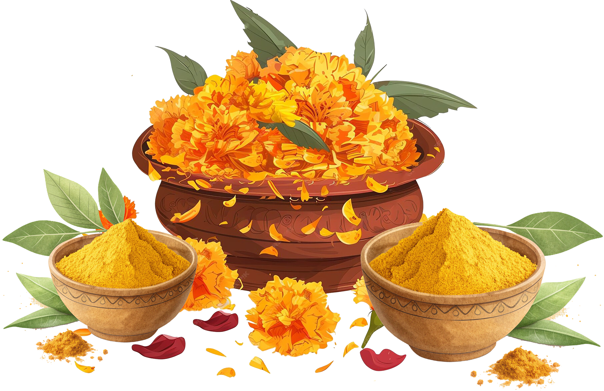 A traditional Bengali pre-wedding ritual symbolizing purification, beauty and blessings. Turmeric (holud) paste is applied to groom and bride to cleanse the skin, preceded by a ceremony to repel negative energy before the wedding. It’s a joyous event where family and friends unite through shared rituals, music and songs.